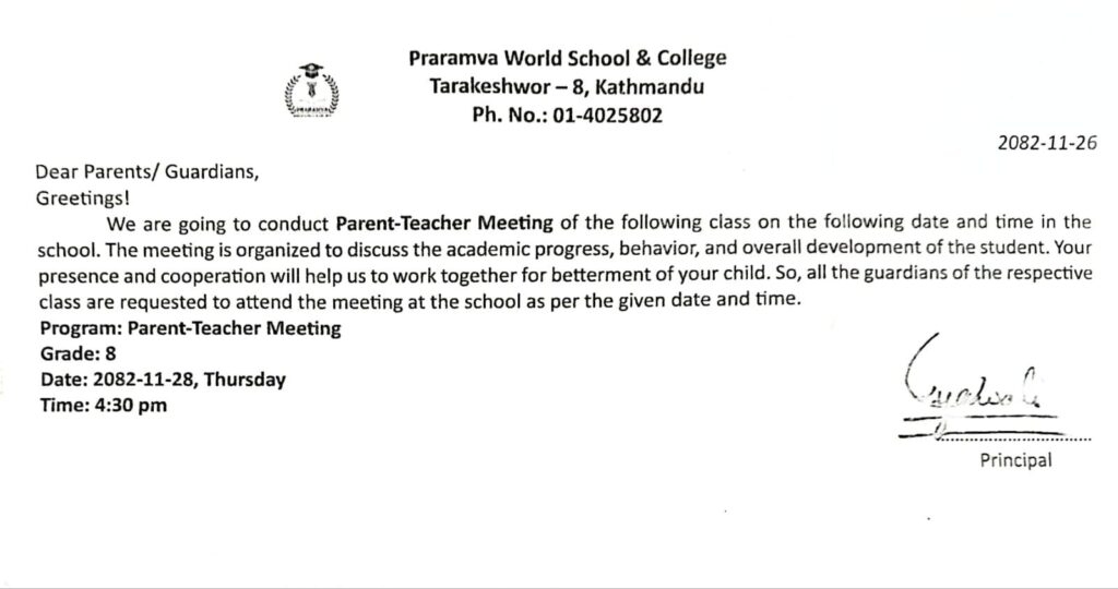 Parent-Teacher Meeting (Grade 8) Posted by admin Categories Notice Date March 11, 2026 Comments 0 comment Share: admin Previous post Parent-Teacher Meeting (Grade 1) March 11, 2026 Next post Parent-Teacher Meeting (Grade 6) March 11, 2026 You may also like Hotel Visit Notice for Class 11 and 12 April 10, 2026 Parent-Teacher Meeting (Grade 6) March 11, 2026 Parent-Teacher Meeting (Grade 1) March 10, 2026