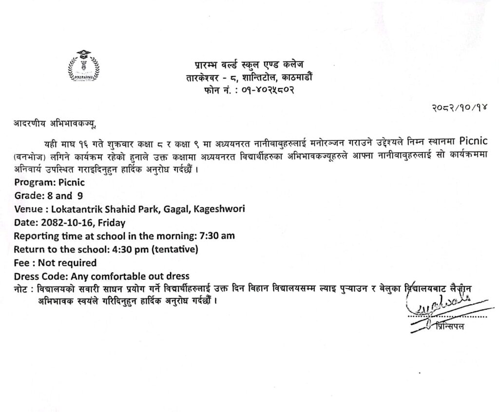 Picnic to Lokatantrik Shahid Park, Gagal, Kageshwori (Class 8 & 9) Posted by admin Categories Notice Date January 28, 2026 Comments 0 comment Share: admin Previous post Meeting cum Parenting Session (UKG & 1) January 28, 2026 Next post Praramva FETE - 2082 February 5, 2026 You may also like Hotel Visit Notice for Class 11 and 12 April 10, 2026 Parent-Teacher Meeting (Grade 6) March 11, 2026 Parent-Teacher Meeting (Grade 8) March 11, 2026