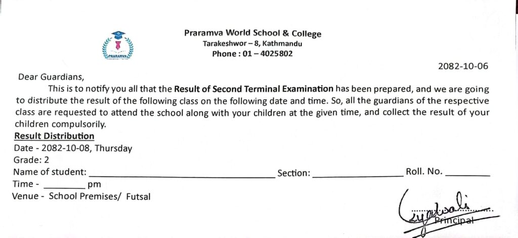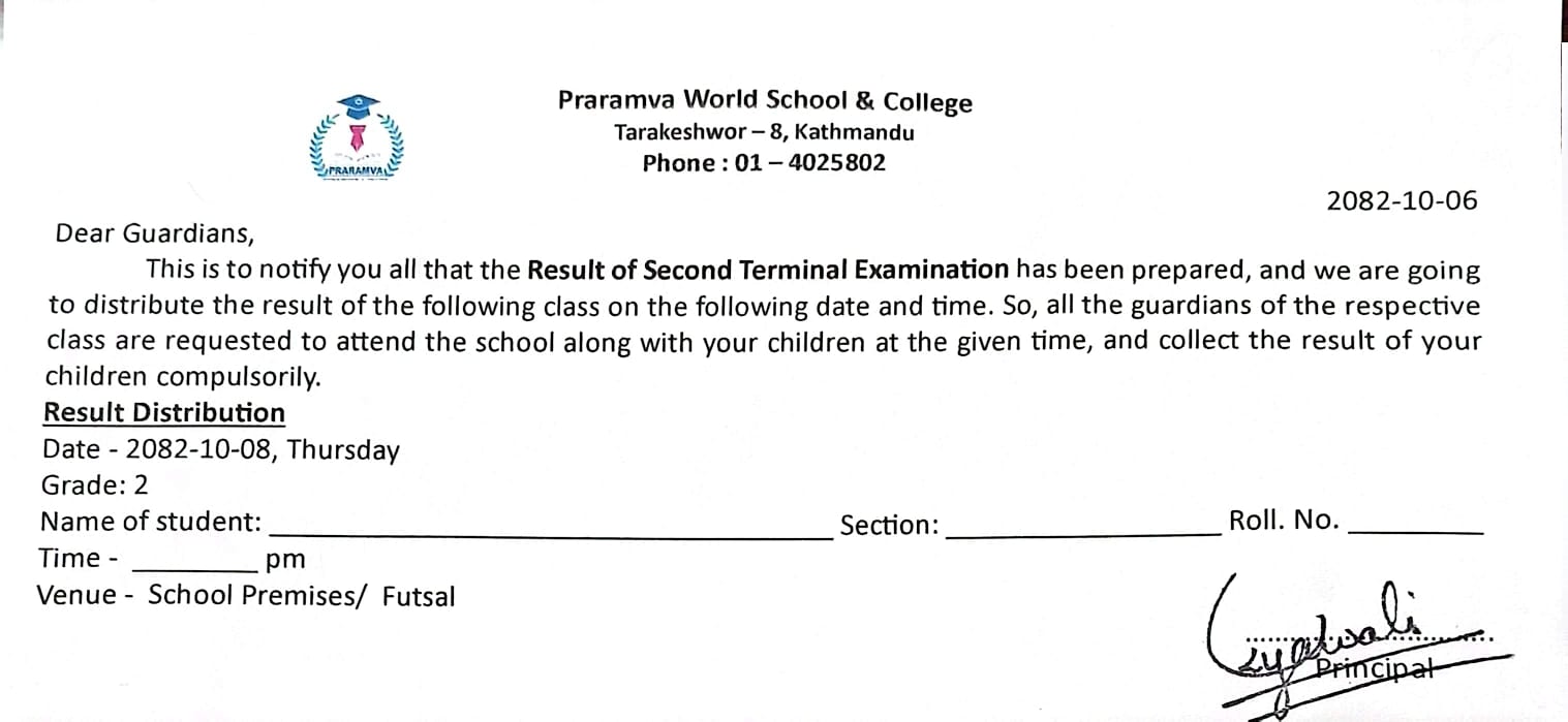 Second Terminal Examination Result Distribution (Class 2) Posted by admin Categories Notice Date January 20, 2026 Comments 0 comment Share: admin Previous post Second Terminal Examination Result Distribution (Class 3) January 20, 2026 Next post Educational Visit to Patan Durbar Square (Class 9) January 25, 2026 You may also like Hotel Visit Notice for Class 11 and 12 April 10, 2026 Parent-Teacher Meeting (Grade 6) March 11, 2026 Parent-Teacher Meeting (Grade 8) March 11, 2026